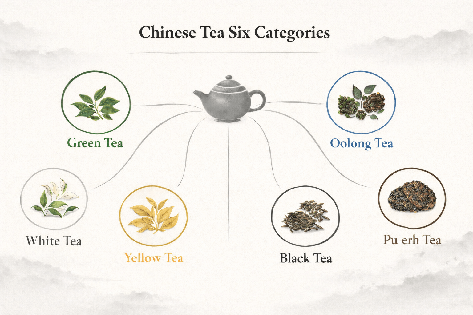 These six major types of Chinese tea are green tea, white tea, yellow tea, oolong tea, black tea, and pu-erh tea. Each type reflects a different level of oxidation and craftsmanship.